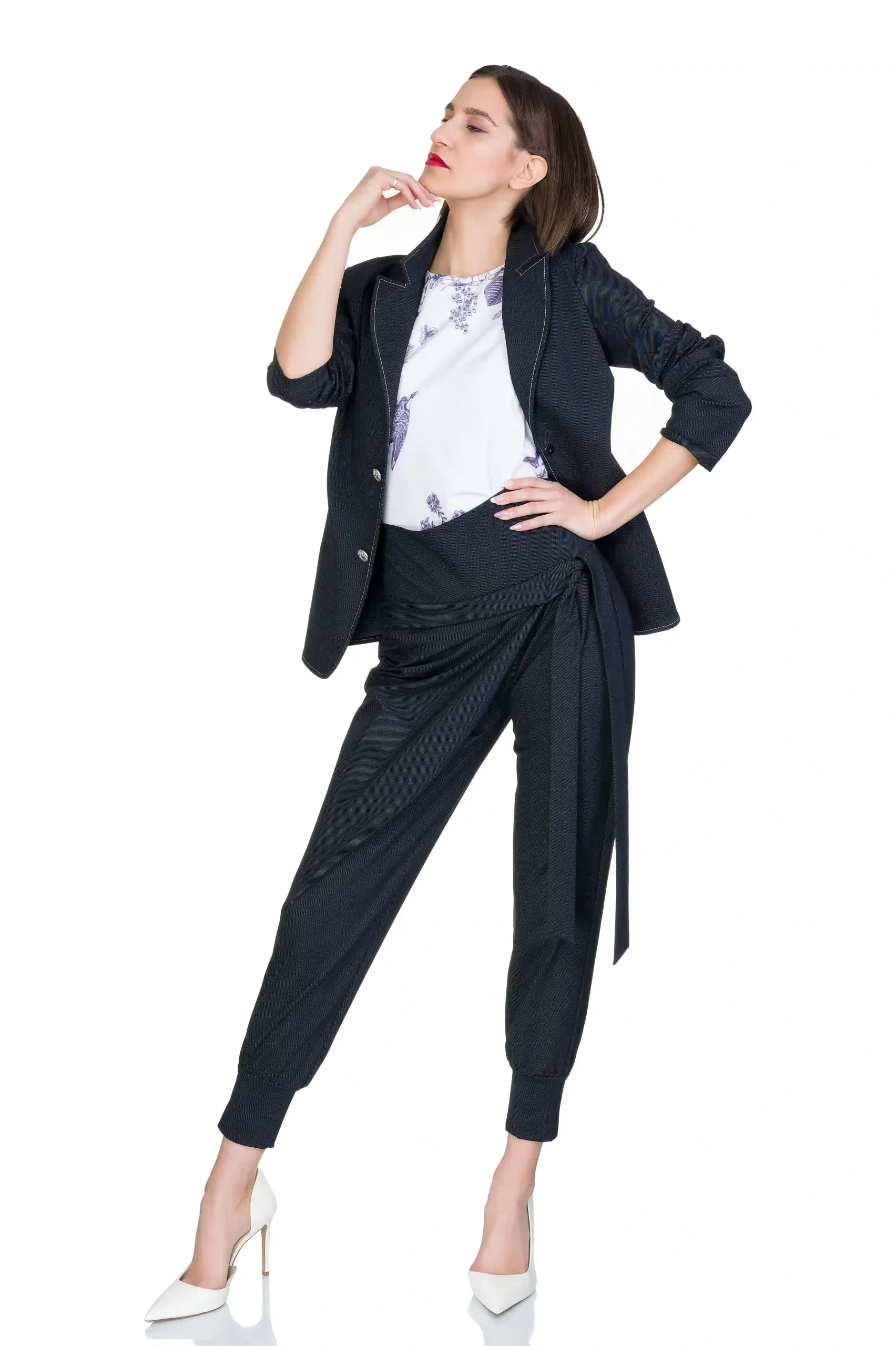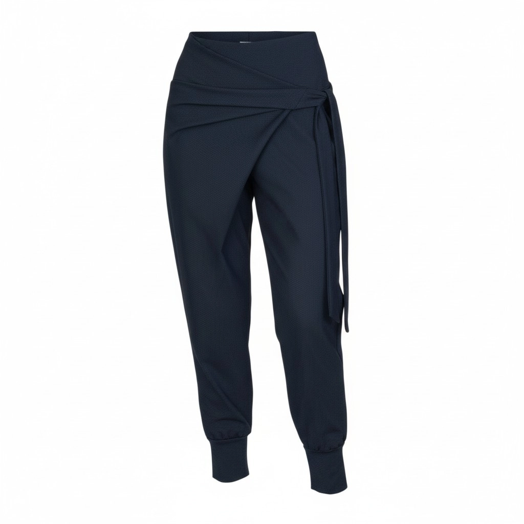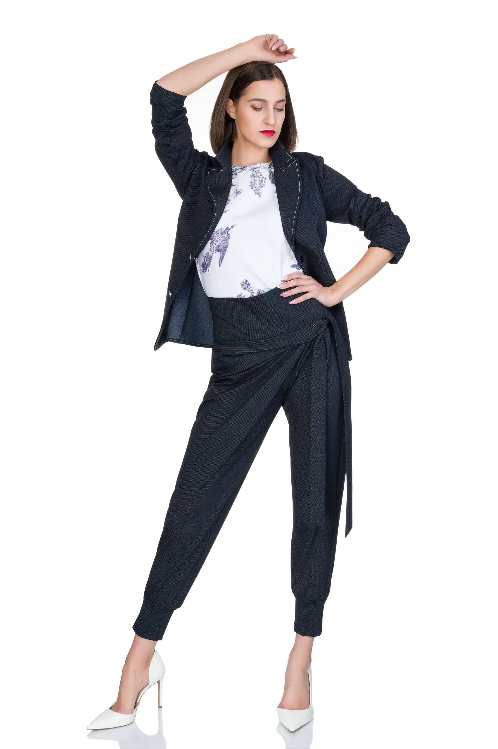Elegantne Akinora hlače z asimetrično gubo in zavezovanjem v pasu. Elastičen material, širok pas in patent spodaj ustvarjajo popolno ravnovesje med udobjem in strukturiranim videzom.